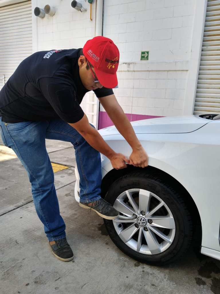 11. Aprieta los birlos: recuerda que para apretarlos, debes colocar la llave en los birlos, pisarla y hacer palanca con tus manos sobre la salpicadera delantera.
