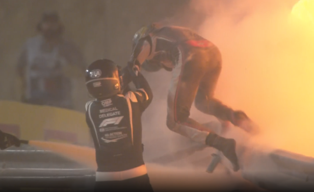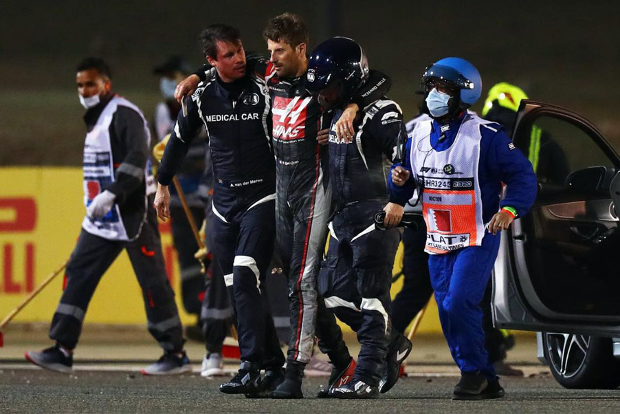 Romain Grosjean quedó atrapado en su monoplaza en llamas después de que explotara en una bola de fuego. Grosjean estuvo dentro del fuego durante unos 18 segundos aproximadamente (según el relato de Ian Roberts el Médico Oficial de F1, y primero en llegar a la escena).