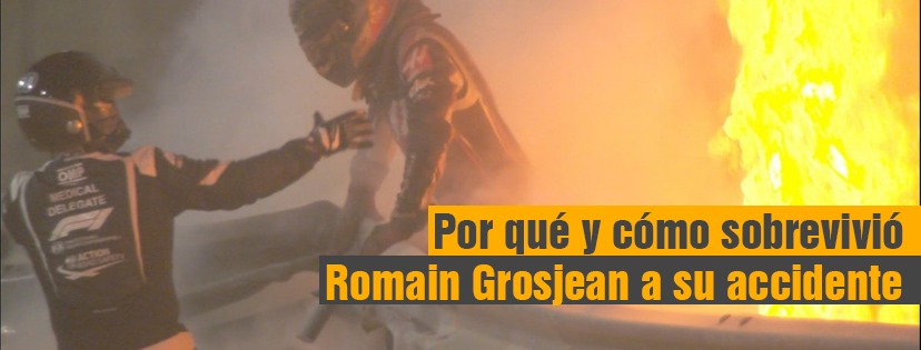 El Vehículo: los autos Formula 1 y su cápsula de seguridad jugaron un papel importante en la supervivencia de Romain Grosjean, pues a la hora de un impacto el vehículo está diseñado para absorber la mayor parte de la energía del impacto al colapsar estratégicamente todos sus componentes de fibra de carbón y honeycomb, así como alerones y llantas alrededor del monocasco (habitáculo), siendo este prácticamente indestructible.
