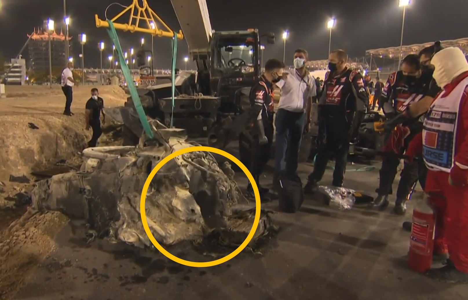 El Halo: en este caso, el vehículo perforó el riel de metal, incrustándose y saliendo del otro lado, en años anteriores este accidente hubiera sido mortal, pues a la hora de atravesar el riel, la cabeza del piloto hubiera impactado directamente con el metal causando una muerte instantánea, sin embargo, hoy en día los monoplazas cuentan con el “Halo” de seguridad alrededor del habitáculo, cosa que protegió a Romain y a su cabeza.