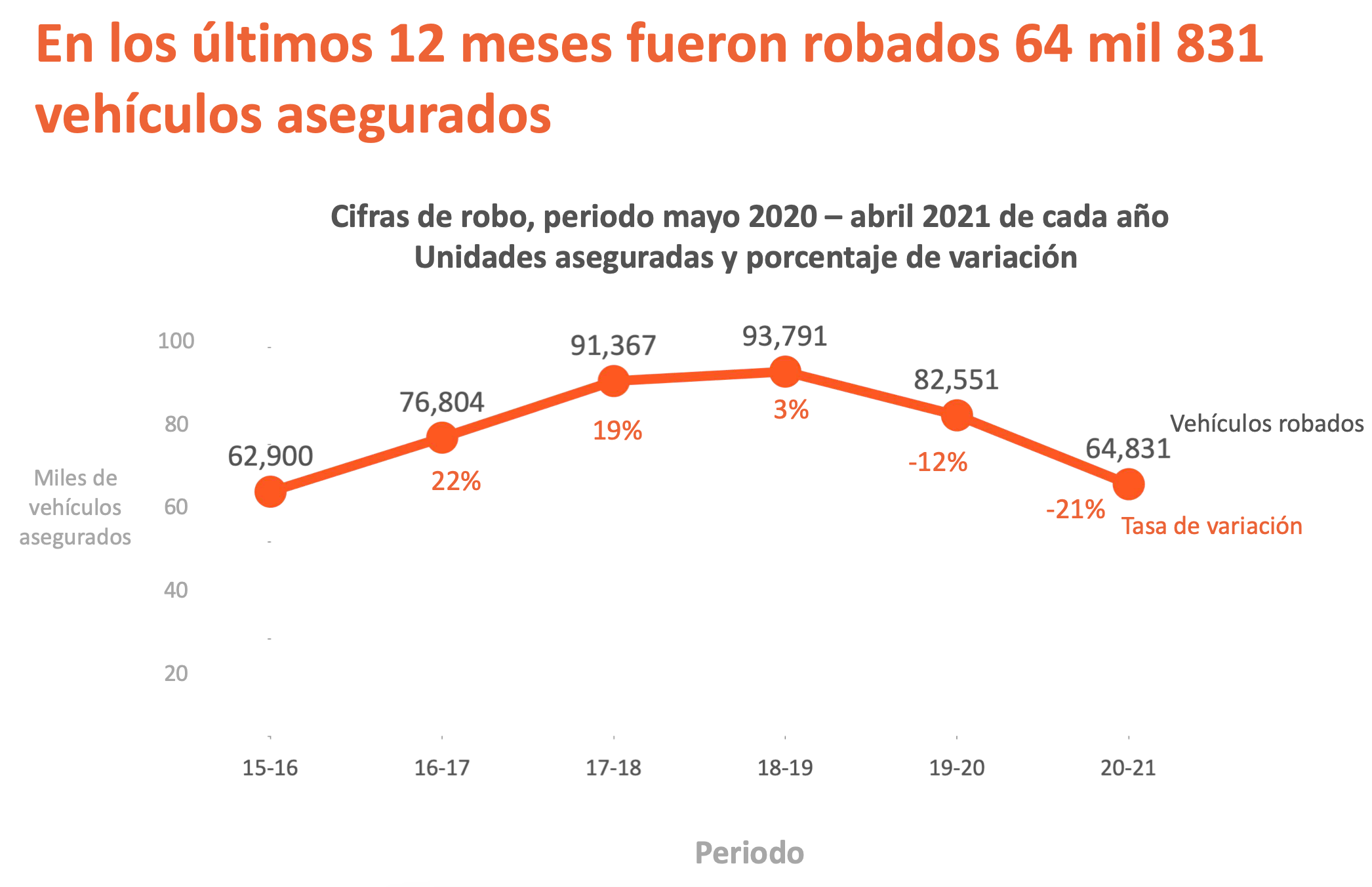 En los últimos 6 periodos se robaron 472,244 vehículos, de ellos 13.7% fueron en los últimos 12 meses. En este periodo se recuperaron 198,125unidades, es decir, un promedio de 33,020 por periodo.